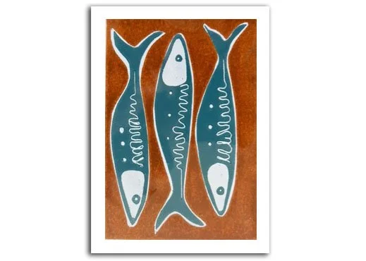 Handprinted card of Mackerel on a orange background. Card is 15 by 11 centimetres, supplied with envelope.