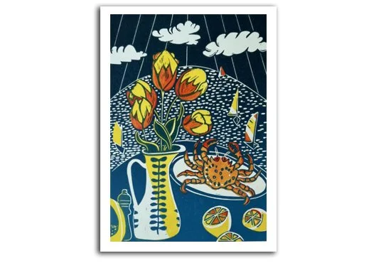 Block lino print of jug with tulips and crab. Dimensions 22 by 17 centimetres. Edition of 11.
