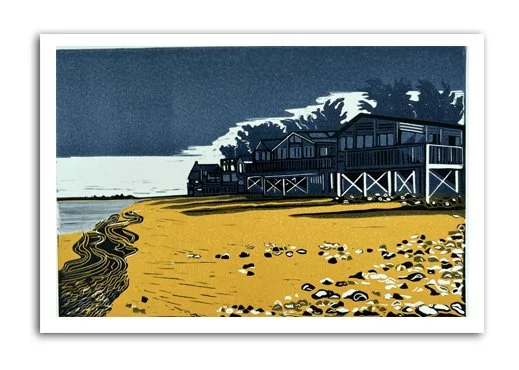 Reduction lino print of the beach huts at Wrabness Dimensions 20 by 30 centimetres. Edition of 11.